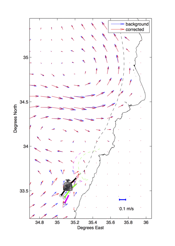 The figure on the right demonstrates the result of assimilating three drifters trajectories, launched from the south of Beirut, with altimetry based geostrophic currents and wind speed data, near the Lebanese coast. The surface velocity field starts from the altimetric one (blue) and is continuously corrected (red) as more drifter and wind data are available.
